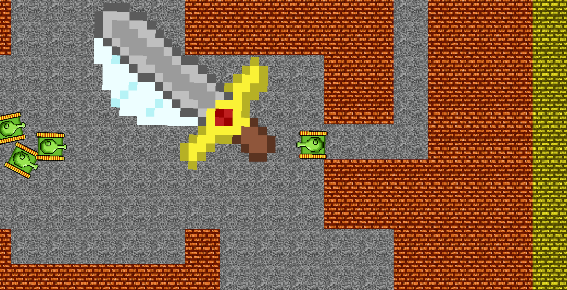 As you can see I am pretty bad at drawing (and programming). So the game has only two unique weapons: a sword and a laser beam. You can pick them up from lootboxes that spawn on the map. Also there are several types of enemies. That is pretty much it. You can also customize the map in the settings (the bigger the map the harder).